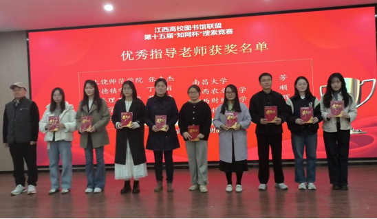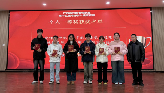 (本网讯:丁晓丽)近日,江西高校图书馆联盟第十五届“知网杯”信息搜索竞赛决赛在江西农业大学图书馆举行。经过多轮激烈角逐,我校由生环学院24级茶学1班杨燚、24级生物工程1班周萌、人文学院23级汉语言文学2班陈珍丽组成的“知行者队”在决赛中荣获团体一等奖,图书馆丁晓丽老师荣获“优秀指导老师”称号。