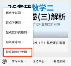 (2)在“学习平台”中点击“智联起点公考网”账号登录使用(第一次使用需注册账号,注册账号必须在校园IP范围内,选择本校,填写相关信息进行注册)