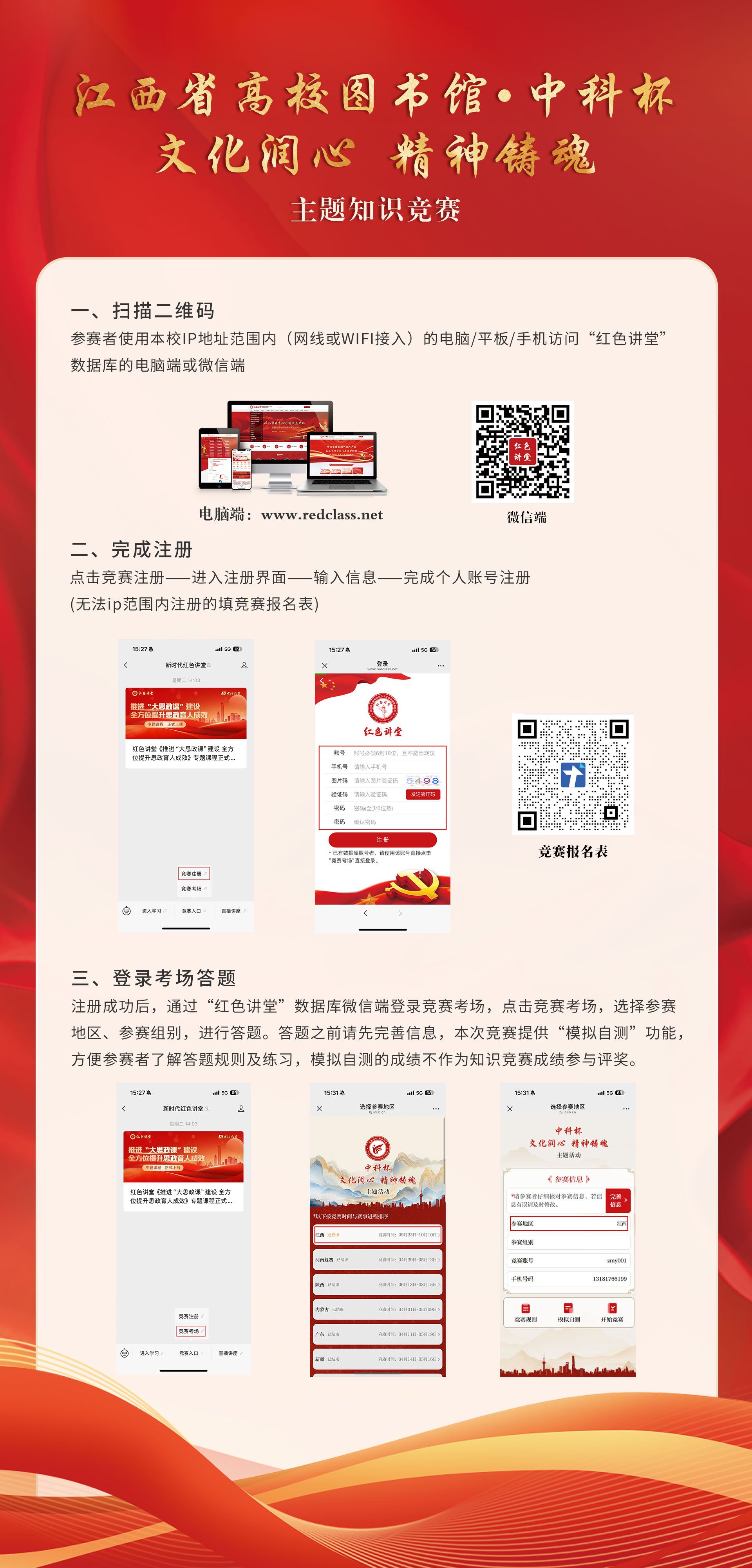源浚者流长,根深者叶茂。文化自信是一个国家、一个民族发展中最基本、最深沉、最持久的力量。为深入学习贯彻习近平新时代中国特色社会主义思想,坚持传承和发展中华优秀传统文化,培育和践行社会主义核心价值观,引导学生坚定文化自信、振奋民族精神,进一步营造坚定文化自信自强的浓厚校园氛围,江西省高校图工委联合省内高校举办“江西省高校图书馆·中科杯‘文化润心 精神铸魂’主题知识竞赛活动”。