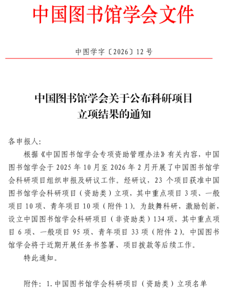 中国图书馆学会科研项目为三年申报一次,本次科研项目申报与研议工作历经5个月,通过严格研议,共设立资助类项目23项、非资助类项目134项,该项目旨在推动图书馆学研究和事业高质量发展,分为资助与非资助两大类,涵盖多个前沿研究方向。中国图书馆学会是由中国科学技术协会主管,图书馆及相关行业科技工作者自愿结成的全国性、学术性、非营利性社会组织。近年来,我馆紧随时代发展,积极探索数字技术与地方文献资源建设的结合,全馆科研氛围浓厚,在科研创新等方面逐渐取得进步,得到了图书馆业界的认可。