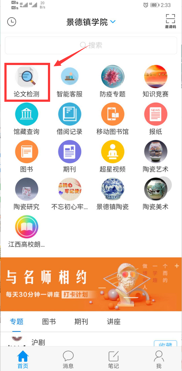 登陆后在首页右上角输入邀请码“jdzxytsg”,进入景德镇学院图书馆首页,第一个模块即“论文检测”。