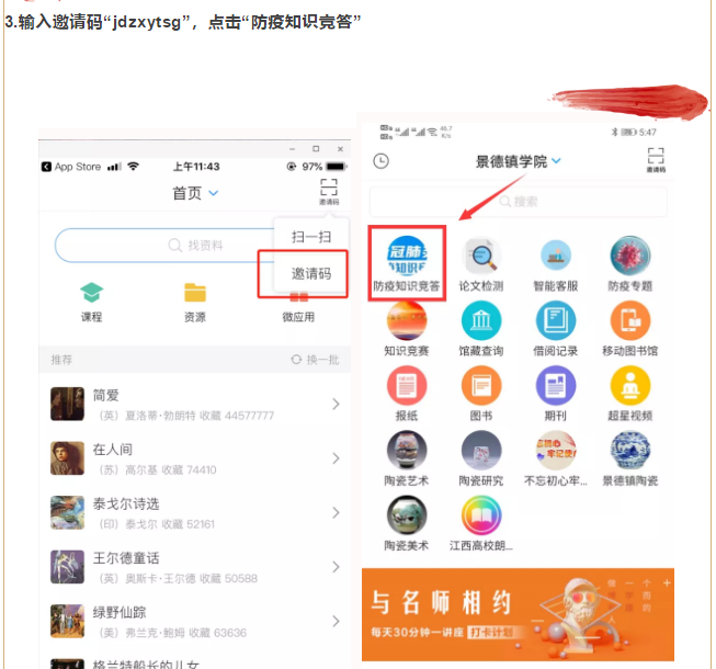 下载学习通,输入本学校的邀请码,点击进入“防疫知识竞答”模块,开始答题。具体如下图: