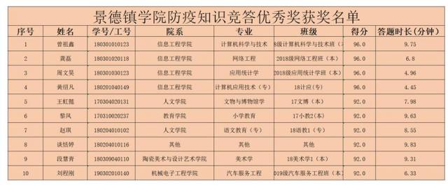 本次防疫知识竞答活动为期17天,共有1004名同学踊跃参与。获得90分以上的同学共有16名,其中获得满分100分的同学有5名。根据总分优先,答题时间优先的原则,评选出获奖同学。