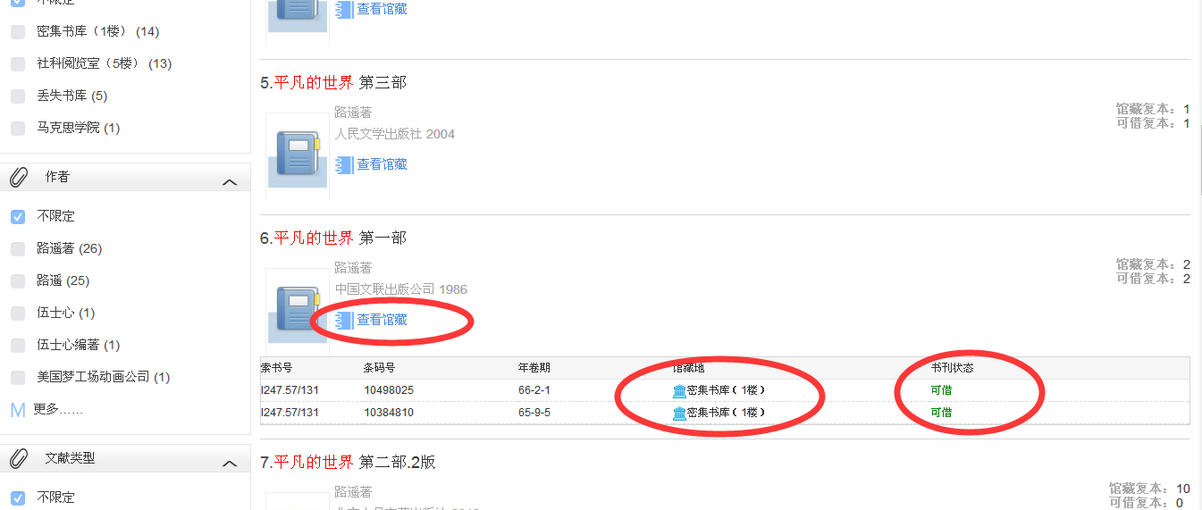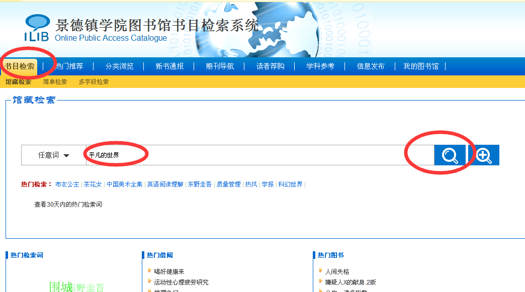 步骤二:点击书目检索,以查找《平凡的世界》图书为例,输入书名,点击
