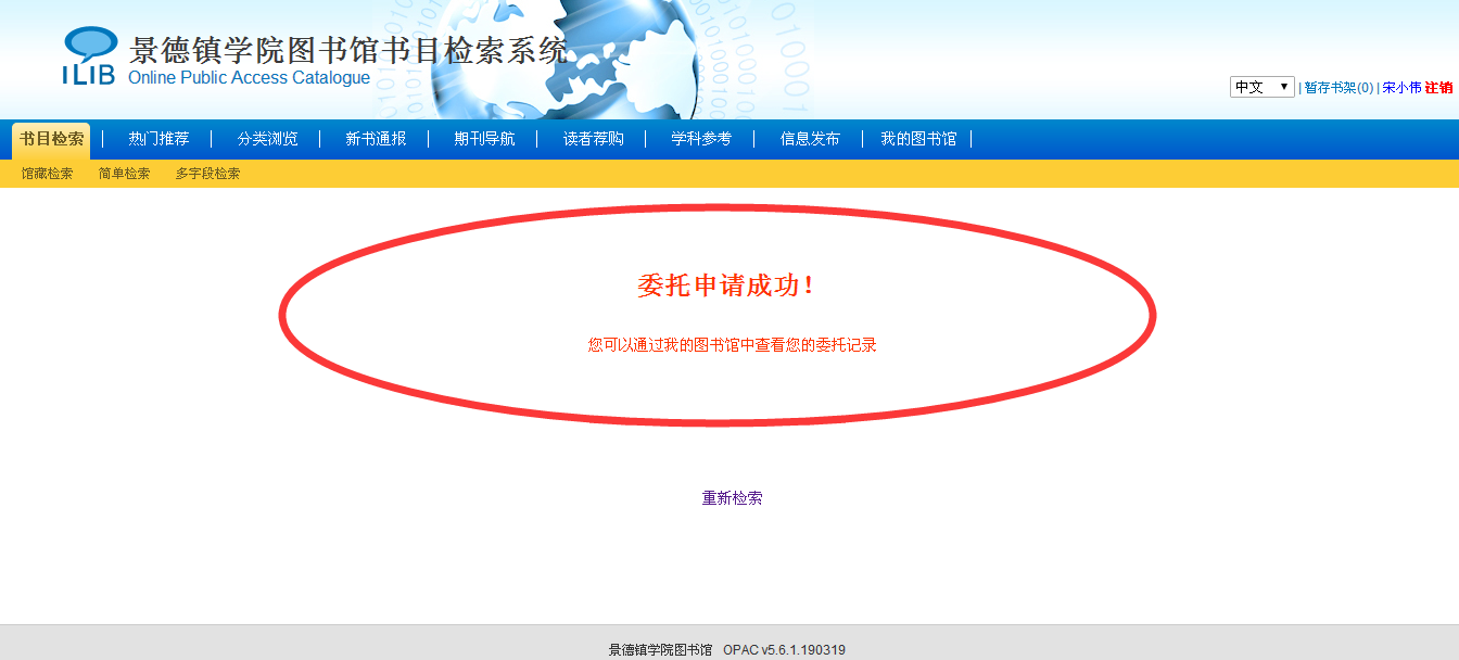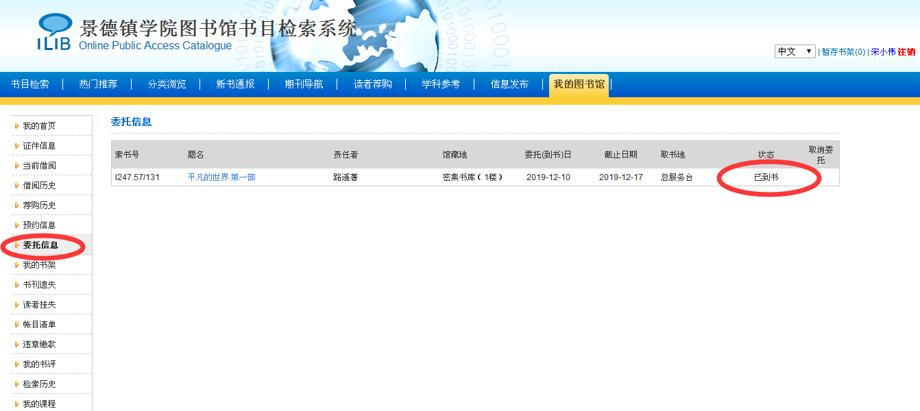 步骤五:及时查看我的图书馆,“委托信息”中图书状态为“已到书”,按照我馆规定时间到图书馆二楼大厅总服务台借阅委托的图书。