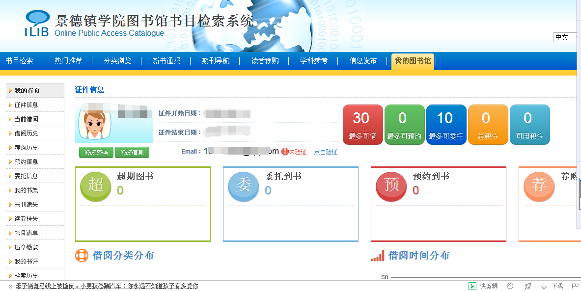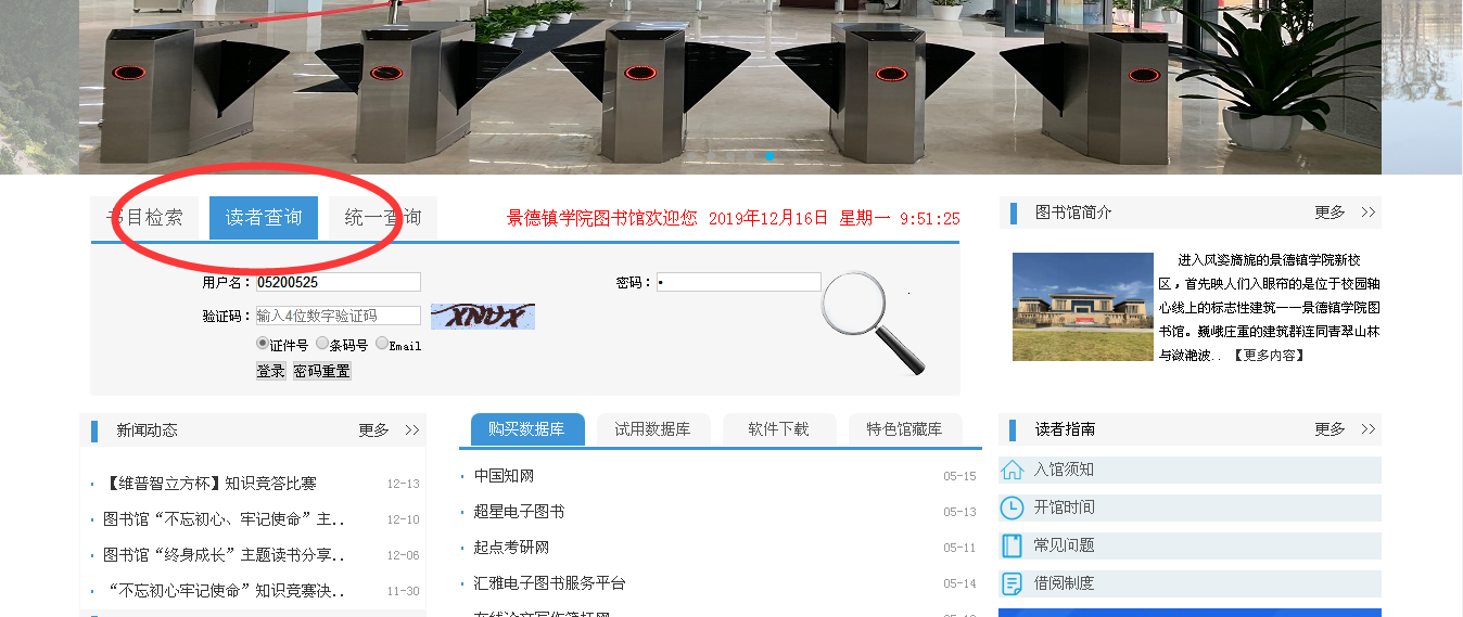 步骤一:进入景德镇学院图书馆网站首页点击读者查询,进入我的图书馆输入用户名、密码及验证码(选择默认证件号登录方式,用户名及密码均为学生证号,教工为教工号,初次登录后需更改密码)