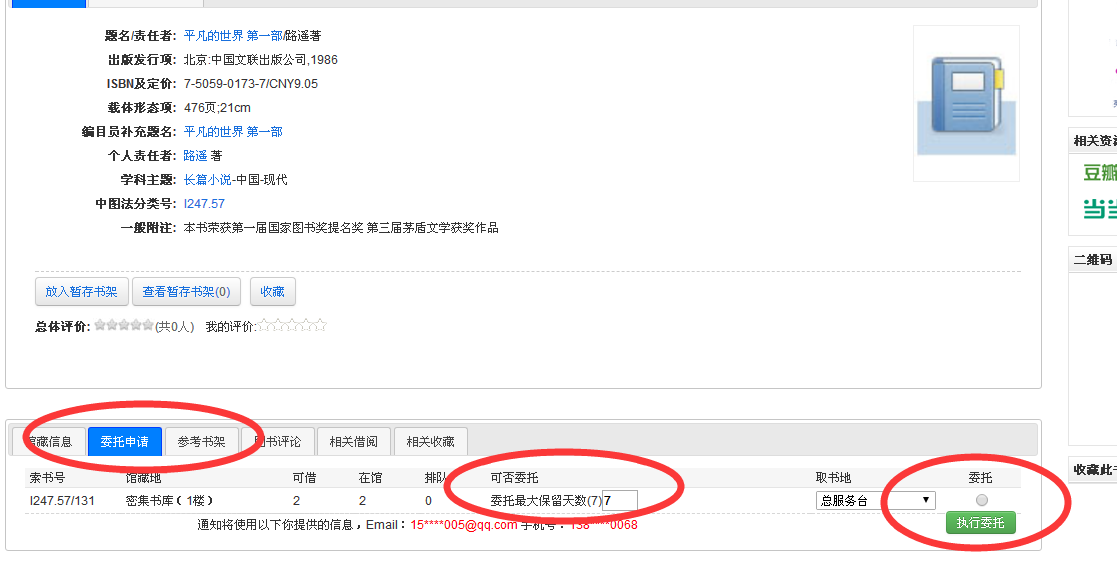 步骤四:点击书名进入如下界面,进行“委托申请”。我馆默认取书地在总服务台,点击“委托”和“执行委托”。